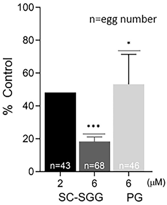 Pretreatment of eggs with SC-SGG reduces their fertilization rates. Mature eggs (15–25) in a droplet of KSOM-0.03% BSA were treated (37 °C, 5% CO2, 1 h) with 0, 2 and 6 µM SC-SGG or 6 µM PG. Eggs treated with 0 µM SC-SGG (untreated) served as controls. Eggs were then washed successively in 3 KSOM-0.03% BSA droplets to remove excess unbound SC-SGG or PG. They were subsequently added into 500 µL of KSOM-0.03% BSA in a culture plate containing 1 million capacitated PGC sperm. The gamete co-incubation duration (2 h) in the culture plate, the washing of excess unbound sperm from the sperm–egg complexes and further culturing (another 4 h) of the sperm–egg complexes in droplets of KSOM-0.1% BSA-AA were performed following the same procedures as described in Figure 4. The presence of two pronuclei in each egg, as the indication of successful fertilization, was then assessed. The in vitro fertilization rates of the gamete co-incubates with eggs pretreated with 6 µM SC-SGG or 6 µM PG were reported as means ± SDs of percent control from three replicate experiments. ANOVA was performed on the raw data (% eggs fertilized) among untreated control samples and those with eggs pretreated with 6 µM SC-SGG or 6 µM PG. *, *** denote p < 0.05 and 0.001, respectively. However, experiments with eggs pretreated with 2 µM SC-SGG were performed twice, and the average of their percent control was reported. n = total number of eggs in all replicate experiments.