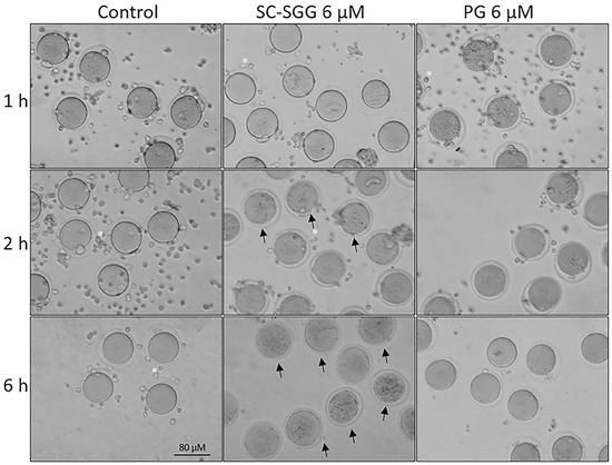 Morphology of control eggs and eggs treated with SC-SGG or PG for various time periods. Mature eggs (15–20) in a droplet of KSOM-0.03% BSA were treated (37 °C, 5% CO2) with 0 and 6 µM SC-SGG or 6 µM PG for 1, 2 and 6 h. Eggs treated with 0 µM SC-SGG served as controls. At the end of each treatment time, eggs were washed successively in 3 KSOM-0.03% BSA droplets to remove excess unbound SC-SGG or PG, and their morphology was microscopically recorded. Small cells (*) surrounding the eggs were cumulus cells, which were dissociated from the eggs by hyaluronidase treatment of cumulus–oocyte complexes. Arrows in the bottom-middle panel signify the degenerated feature of eggs treated with SC-SGG for 6 h. These eggs contained dark, clumped elements in the cytoplasm. Data presented were representative of three replicate experiments.