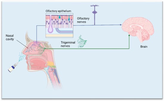 The olfactory and trigeminal nerve pathways are in direct nose-to-brain drug transport. Reprinted from [11] under the Creative Commons Attribution (CC BY) license (https://creativecommons.org/licenses/by/4.0/, accessed on 1 April 2025). The original figure was created with BioRender.com.