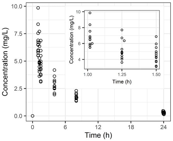 Levofloxacin concentration–time profile in healthy adults. The main plot represents the entire sampling period, and the inset highlights the concentration–time profile during the early phase (1.0–1.5 h). The open circles are observed drug concentrations.