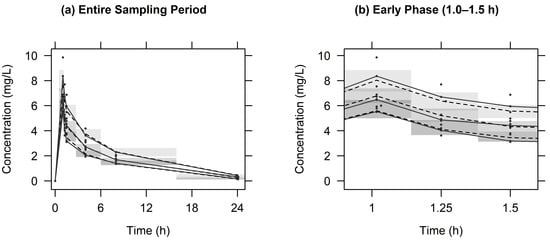 VPC based on simulated concentrations from 1000 virtual datasets of LVX: (a) the entire sampling period, (b) the early phase (1.0–1.5 h). Closed circles—observed concentrations; solid lines—10th, 50th, and 90th percentiles of observations; dashed lines—10th, 50th, and 90th percentiles of simulated concentrations; shaded areas—95% confidence intervals for the 10th, 50th, and 90th percentiles of simulated concentrations.