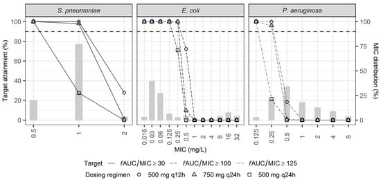 PTA of current guideline-recommended levofloxacin dosing regimens (500 mg q12 h, 750 mg q24 h, and 500 mg q24 h) for patients with CrCl ≥ 50 mL/min. The PTA was evaluated at pathogen-specific PK/PD targets: fAUC/MIC ≥ 30 for Streptococcus pneumoniae, fAUC/MIC ≥ 100 for Escherichia coli, and fAUC/MIC ≥ 125 for Pseudomonas aeruginosa. Gray bars indicate MIC distribution of respective pathogens. The dashed red horizontal lines indicate the PTA threshold of 90%.