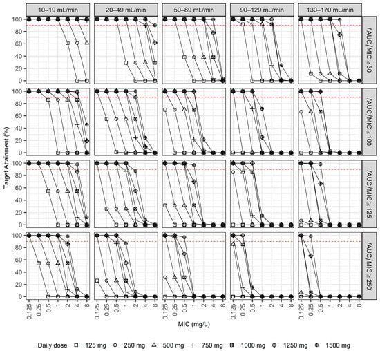 PTA across various levofloxacin daily doses stratified according to narrower CrCl intervals (CrCl: 10–19, 20–49, 50–89, 90–129, and 130–170 mL/min). Simulations were performed at four PK/PD targets (fAUC/MIC ≥ 30, 100, 125, and 250) across different MIC values. The dashed red horizontal lines indicate the PTA threshold of 90%.