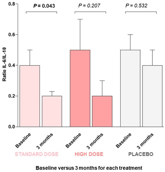 Then, we determined the IL-6/IL-10 ratio to establish the balance between pro- and anti-inflammatory cytokines. At the beginning of this study, all three groups had similar values for this parameter (0.4 ± 0.08, standard dose; 0.5 ± 0.2, high dose; 0.5 ± 0.1, placebo group). However, after 3 months of intervention, the groups that ingested the standard dose of DMB showed the greatest reduction in the ratio (0.2 ± 0.03, p = 0.043, standard dose; 0.2 ± 0.1, p = 0.207, high dose; 0.4 ± 0.1, p = 0.532, placebo group) (Figure 1).