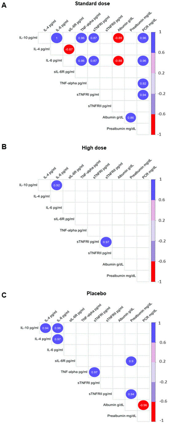Correlations were observed between markers of inflammation and selected variables of nutritional status. (A) Standard dose of DMB; (B) high dose of DMB; (C) placebo. Plots show only significant and corrected associations. Red and purple lines indicate the correlation values, with negative correlations highlighted in red (−1) and positive correlations highlighted in purple (+1). IL, interleukin; PCR, C-reactive protein; TNFR, soluble TNF receptor; TNF-α, tumor necrosis factor-α. Only correlations with p > 0.05 are shown.