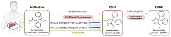 Methadone metabolism in the liver. Created with BioRender (https://app.biorender.com/, accessed on 16 April 2025).