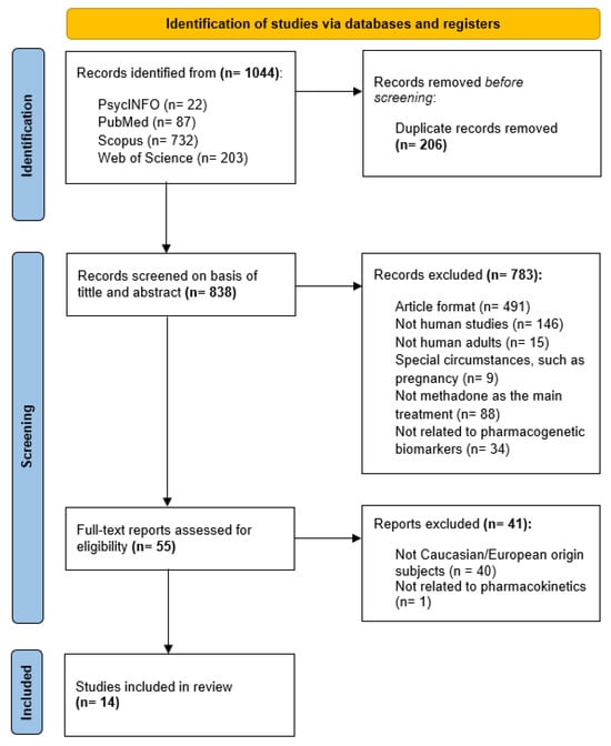 The designed search strategy identified a total of 1044 articles from the four scientific databases chosen (PsycINFO, PubMed, Scopus, and Web of Science). After the removal of duplicates (206 records), title/abstract screening was performed, leading to the exclusion of a total of 783 articles for not meeting inclusion criteria. Full-text assessment ended up with 14 articles for final inclusion in this systematic review.