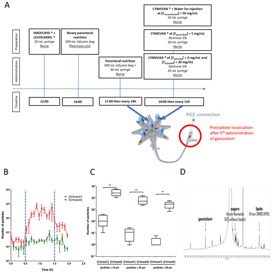) correspond to the start and the end of the ganciclovir infusion (t = 30 min and t = 1.5 h, respectively). The results are expressed as the mean ± Standard Deviation (SD) (n = 5). (C) The impact of the ganciclovir concentration on the particulate load. Comparisons of the particulate load were ≥10 µm, the particulate load was ≥25 µm, and the particulate load was ≥50 µm in PN + ganciclovir at [Cinfused1] = 3 mg/mL or PN + ganciclovir at [Cinfused2] = 30 mg/mL. The results are expressed as the median (range) (** p < 0.01 in a Mann–Whitney test, n = 5). (D) 1H nuclear magnetic resonance (NMR) spectra of the precipitate in deuterated DMSO (400 MHz, Bruker, Wissembourg, France) showing the presence of ganciclovir, and sugar and lipids from NUMETAH® G13% without lipids and SMOFLIPID®, respectively, from identified representative peaks.