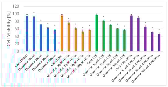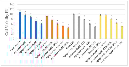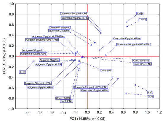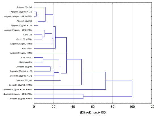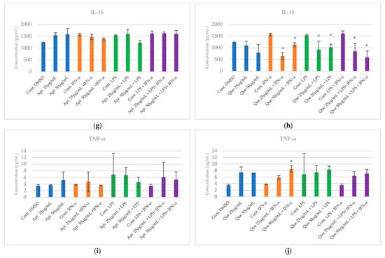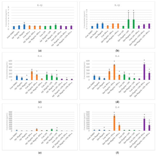 2.3. Statistical Analysis Comparing Effects of Apigenin and Quercetin on the Production of Selected Cytokines in LPS, IFN-α and LPS+IFN-α Stimulated HGF-1 Cells
