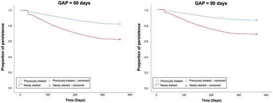 Statin treatment persistence, considering a 60-day gap, was 92.65% at 3 months, decreasing to 85.56% at 6 months and 78.28% at 12 months. Persistence was significantly higher in the group of previously treated statin patients at all time intervals. The mean persistence time was 316.63 days, which was also higher in the group of previously treated statin patients (326.37 days vs. 277.15 days; p = 0.001). Kaplan–Meier analysis showed differences in persistence over time between patients in both cohorts. The Cox regression model adjusted for all significant variables showed that previously treated statin patients were more likely to persist on statin therapy (AHR: 2.08; 95% CI: 2.06–2.11; p = 0.001) (Table 2). Sensitivity analysis showed that similar results were obtained when persistence was assessed at 60 or 90 days (Figure 1).