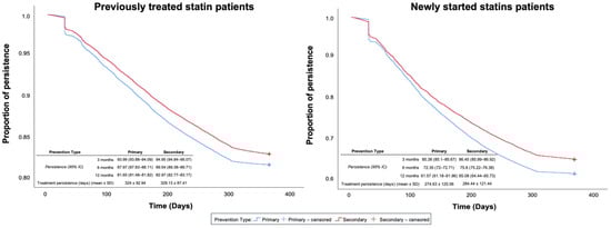 Kaplan–Meier analysis for treatment persistence in newly started and previously treated statin patients considering primary and secondary cardiovascular prevention.
