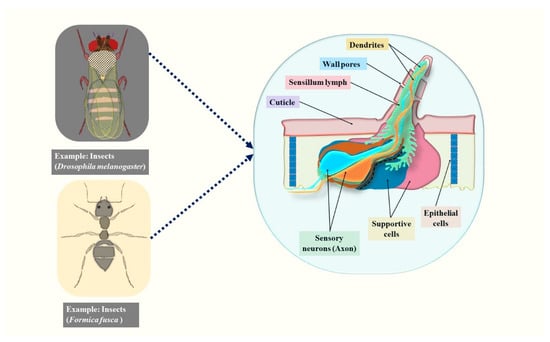 Animals possess exceptionally sophisticated olfactory mechanisms, capable of distinguishing between intricate odorous substances and recognizing minuscule odorous amounts, which result from millions of years of evolution. Alternatively, insects also possess the potential to distinguish odorous substances because of their very advanced sense of smell; therefore, these are considered less expensive and simpler to raise in under-regulated situations [21,22]. Insects possess highly developed olfactory or sensory networks, which particularly facilitate detection and consequent reactions to volatile stimuli in the atmosphere and play a significant role in their capacity to adapt biologically [23]. Recognizing or biologically defining receptors for olfactory stimuli, the neuronal networks through which they generate, including the regulation of sensory/smell-determine- motions, particularly in Drosophila melanogaster (D. melanogaster), are all topics that have received an enormous amount of attention over the last 20 years [24,25,26,27,28]. A significant proportion of olfactory stimuli nerve display a pair of independent odorant receptors as well as ionotropic receptors [29,30,31] that comprise odorant-gated ion channels, a phenomenon that is hypothetically enough capable of converting the emission of chemical smells towards depolarization of membranes inside of cells and they function inside intricate sensory cells known as sensilla [32] (Figure 1). As insects are capable of spotting VOCs from lineages of cancerous cells, such insects may be employed as cancer bio-detectors since chemical smells from various cancerous cell lines cause distinct sensory receptor responses in the signal [33]. Similarly, carpenter ants are exceptionally skilled in distinguishing distinct odorants and additionally differing quantities of the same chemicals [34,35,36]. As evident from the current body of literature, no comprehensive review has yet explored the application of insect olfactory sensing systems in detecting cancer-associated VOCs. The present review addresses this gap by highlighting bioinspired olfactory strategies and their emerging relevance in oncological diagnostics.