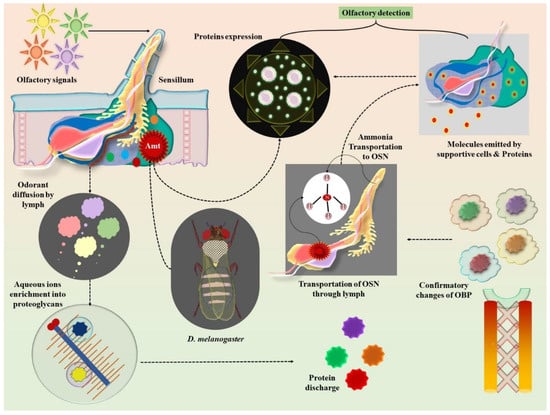 Olfactory sensory receptors initiate odorant-induced neural activity by triggering ligand-dependent membrane depolarization across various cell types. In natural settings, olfactory signalling is shaped by the combined presence of multiple odor molecules and chemically diverse compounds, along with the dynamic regulation of receptor sensitivity. The sensilla lymphatic fluid contains ionic amalgamation (fluid-filled), rich in released amino acids along with proteoglycans, where odors need to pass during penetration to sensillum [76]. The physicochemical properties of odorant molecules determine the rate at which ions may penetrate the sensillum, pass via lymph, and be integrated into the olfactory sensory neuron (OSN) layer [77,78]. Olfactory-binding proteins (OBPS) recognize and bind a structurally diverse range of odorant molecules, each with distinct binding affinities determined by their chemical characteristics. Ligand binding induces specific conformational alterations in OBPs, which facilitate odorant transport and contribute to the initial steps of olfactory signal transduction [79,80]. The OSN exists when they discharge odor to the receptors, potentially provoked by regional pH variations close to the cilia membranes or through hypothetical interactions of OBPs with cilia proteins found in the membrane. This is how OBPs have historically been thought to function: they communicate with and convey hydrophobic ligands through the lymph fluid to the OSN [80]. Electrophysiological and psychological responses to the pheromone cis-vaccenyl acetate (cVA) in D. melanogaster depend on the OBP LUSH (also known as OBP76a). While LUSH could assist in the transport of cVA to the homologous receptor (OR67d), it is not a crucial component of the signal transduction system because supraphysiological amounts of pheromone remain capable of triggering some neuronal activation [81,82].