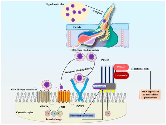 Molecular signalling pathway of olfactory proteins towards the receptors. The representation of the olfactory transduction pathway concerning insect olfactory sensory neurons (OSNs) to better clarify the complexities of the identification of volatile and non-volatile pheromonal molecules. As the pheromonal ligands pass through wall pores and enter the cuticular space, they are bound by the OBPs and transported to the OR complex present on the ciliary membrane. Activated by ligand, the cloned OR-ORCO heterodimer functions as an ionotropic channel to provide the cells rapid access to Na+, K+, and Ca2+ ions, which cause cytosolic depolarization. Hydrophobic pheromones are transported by SNMP1, a transmembrane protein; there is also a PPK25 channel that is regulated by calmodulin and should intensify the signal. Altered PPK25 or the calmodulin-binding domain affects the OSN’s ability to respond, leading to poor sensing of non-volatile, high-affinity pheromones used in fine-tuning insect behaviors.