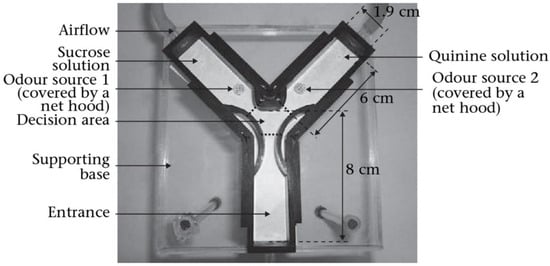Camponotus aethiops (C. aethiops) served as the experimental subject for the initial tethered Ant technique [127]. Ants were trained to link a positive affirmed smell (RS+) with a mixture of sugar (US+) and a negative affirmed smell (RS−) with quinine (US−) through divergent training [74,128]. A series of 12 training experiments ((6 RS+) and (6 RS−)) revealed outstanding capability to learn in Camponotus fellah (C. fellah), as evidenced by their ability to keep a learned connection for a period of 72 h [129]. Protein formation inhibitors were used to demonstrate that the recall created after training represented true long-lasting recall since true long-lasting recall requires de novo protein formation [130]. By using free movement theories, the ants are set up in an atmosphere that seems more analogous to their natural environment. Camponotus mus and C. fellah’s sensory (olfactory) memory were examined using a distinct Y-maze setting (Figure 4) [131]. Ants had no trouble distinguishing between positively affirmed smell and the opposite group following a set of 24 training studies, which took place moments after the conditioned process was completed. Afterwards, C. fellah revealed and created memories that remained for a maximum of 72 h following adaptation with a similar model [132]. Round courts are additionally beneficial in studying free-movement frameworks. Throughout the recall assessments, C. aethiops liked to indulge in a longer period close to cuticular compounds (hydrocarbon) spectra used as RS instead of an unfamiliar odor [133,134]. In terms of specific sensory progress, Camponotus ants have received the greatest attention. The nest-mates (labours) in this species are fairly big, and they initially demonstrated an excellent learning skill [74,128].