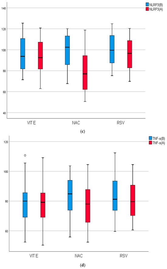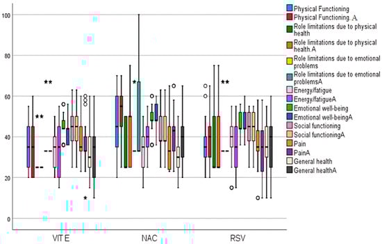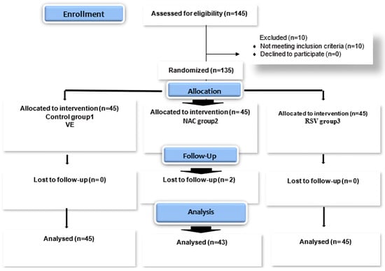 | Control Group (VE) n = 45 | NAC Group n = 43 | RSV Group n = 45 | Test of Significance | Intergroup Significance | ||