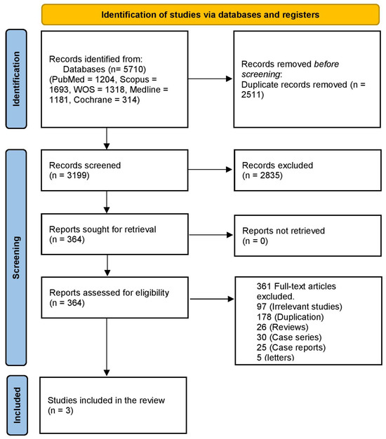 A literature search using PubMed, Scopus, WOS, and Medline revealed 5710 articles, 2511 of which were duplicates. Title and abstract screening were performed on 3199 articles, and 364 articles were retrieved. Then, we reviewed them at the full-text screening stage. Finally, 10 studies were included in this systematic review and meta-analysis. The PRISMA flowchart is shown in Figure 1.