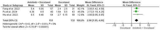 The data of the three studies, including 151 participants in the intervention group and 132 in the control group, were analyzed and showed a significant difference in the PFS between patients who received anlotinib plus docetaxel and patients who received only docetaxel (MD = 2.98, 95% CI = 1.95–4.00; p < 0.00001). The pooled studies were homogenous (p = 0.81, I2 = 0%) (Figure 2).