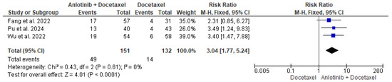 The data of the three studies, including 151 patients in the intervention group and 132 patients in the control group, were analyzed and showed a significant difference in the ORR between patients who received anlotinib and docetaxel and patients who received only docetaxel (RR = 3.04, 95% CI = 1.77–5.24; p < 0.00001). The pooled studies were homogenous (p = 0.81, I2 = 0%) (Figure 3).