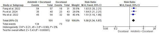 The data of the three studies, including 151 participants in the intervention group and 132 patients in the control group, were analyzed and showed a significant difference in the DCR between patients who received anlotinib and docetaxel and patients who received only docetaxel (RR = 1.58, 95% CI = 1.34–1.87; p < 0.00001). The pooled studies were homogenous (p = 0.90, I2 = 0%) (Figure 4).