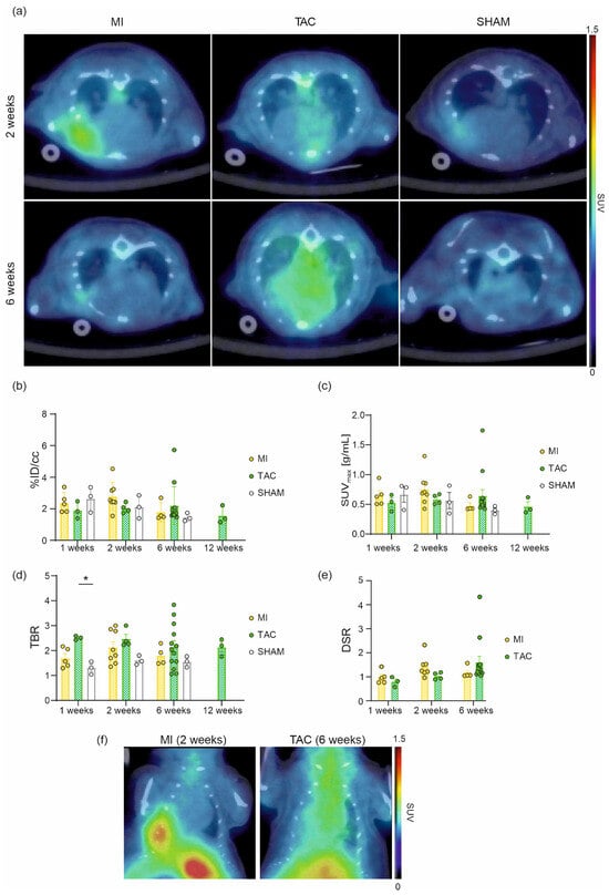 Multimodal (PET/CT) rigid-body image registration and biomedical image quantification was performed using the image analysis software PMOD 3.8 (PMOD Technologies, Zürich, Switzerland). The CT images were fused to the respective PET scans followed by creating volumes of interest (VOIs). The tracer uptake in the VOIs was normalized to injected dose and animal weight. To enable comparability of the results between the animals, values are expressed as percent of the injected dose per cubic centimeter (%ID/cc), as well as the maximum standardized uptake values (SUVmax; g/mL). For calculating the tissue-to-background ratio (TBR), the blood pool was used as the background in both the MI and SHAM groups, whereas the triceps brachii muscle served as the background in the TAC group. This selection was based on the need to account for physiological differences in each model, where the blood pool is a more stable reference in MI and SHAM groups, while muscle tissue, such as the triceps brachii, provides a more relevant background in the TAC group due to the distinct perfusion characteristics. Disease-to-sham ratio (DSR) was normalized to the mean SUVmax value of the respective SHAM cohort.