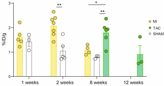 Ex vivo [68Ga]Ga-DATA5m.SA.FAPi quantification of MI, TAC, and SHAM (control) hearts. Cardiac [68Ga]Ga-DATA5m.SA.FAPi uptake of MI, TAC, and SHAM mice 1, 2, 6, and 12 weeks post-surgery. Data are expressed as the mean ± SEM (n = 3–7 animals/group, * p < 0.05, ** p < 0.01); %ID/g = percentage injected dose per gram tissue. MI: myocardial infarction; TAC: transverse aortic constriction.