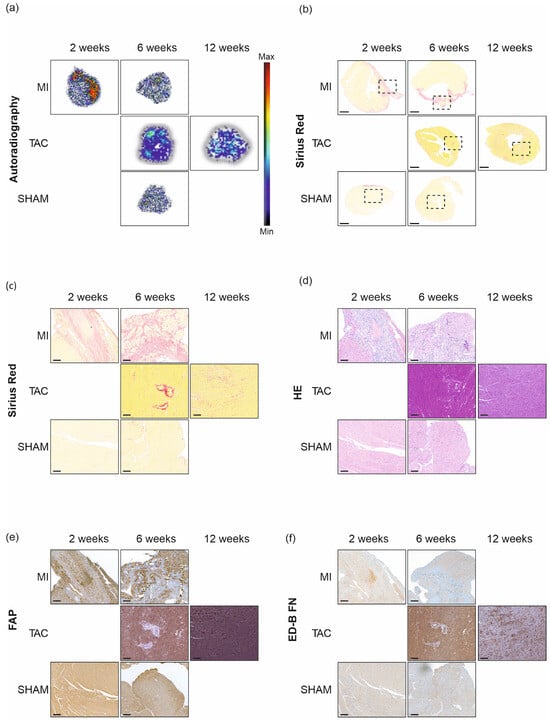 Ex vivo autoradiography, histology, and IHC of MI, TAC, and SHAM (control) hearts. [68Ga]Ga-DATA5m.SA.FAPi autoradiography (a), collagen staining (Sirius Red) (b,c), Hematoxylin/Eosin (HE) (d), FAP (e), and ED-B FN (f) of representative hearts from MI, TAC, and SHAM mice 2, 6, and 12 weeks post-surgery. The area outlined by the dotted frame (b) indicates the selected representative section, which is shown in the subsequent stainings. In (b), a magnification factor of 0.8 was selected, which corresponds to 1.00 mm in the size bar shown. In (c–f), a magnification factor of 10 was selected, which corresponds to 0.100 mm in the size bar shown. MI: myocardial infarction; TAC: transverse aortic constriction.