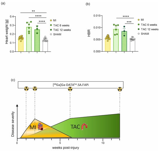 Ex vivo biodistribution analysis (Figure 2) corroborated the imaging outcomes, revealing a significantly increased cardiac uptake of [68Ga]Ga-DATA5m.SA.FAPi in MI mice two weeks after surgery and in TAC mice six weeks post-surgery. Consistent with the in vivo imaging data, SHAM mice exhibited the highest uptake at the early stage. TAC mice were used for longitudinal imaging measurements; hence, ex vivo data were not available for the one- and two-week time points. The observed disparities in heart weight between the MI, SHAM, and TAC mouse models are closely associated with the different disease progression of myocardial infarction and pressure overload heart failure, as evidenced by the heart-to-bodyweight ratio (Figure 4a–c).