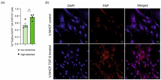 In vitro cell analyses. (a) [68Ga]Ga-DATA5m.SA.FAPi uptake under high- and low-stretched conditions in ventricular human cardiac fibroblasts. Data are expressed as the mean ± SEM (n = 4 individual experiments/group, * p < 0.05). (b) FAP expression in control (top row) and TGF-β treated (bottom row) V-NHCF cells. Representative photomicrographs of nuclei immunostaining using DAPI (left column), FAP staining (middle column), and the merged stainings (right column). The white line represents the scale and corresponds to 20 µm. Control V-NHCF cells (n = 3) and V-NHCF TGF-β treated (20 ng/mL) for 24 h (n = 3). V-NHCF: ventricular normal human cardiac fibroblasts.