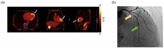 - Notohamiprodjo, S.; Nekolla, S.G.; Robu, S.; Asiares, A.V.; Kupatt, C.; Ibrahim, T.; Laugwitz, K.-L.; Makowski, M.R.; Schwaiger, M.; Weber, W.A.; et al. Imaging of cardiac fibroblast activation in a patient after acute myocardial infarction using 68Ga-FAPI-04. J. Nucl. Cardiol. 2022, 29, 2254–2261. [Google Scholar] [CrossRef] [PubMed]