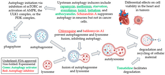 Autophagy modulations by genetic, pharmacological, or dietary means target specific steps of the autophagic pathway. Autophagy can be induced genetically by inhibitors of the mTORC1 and mTORC2 complexes, the activation of the AMP kinase pathway, and the downstream ULK1 and PI3K complexes. Pharmacological interventions such as rapamycin [14,15], everolimus [16], and torin1 [17] are robust mTOR inhibitors and activate autophagy. Dietary intervention by starvation [18] or pharmacologic metformin [19] induces autophagy via the mTOR and AMPK pathways. Trehalose inhibits glucose uptake, inducing starvation [20]. Schizandrin A induces autophagy and apoptosis in cancer cells [21] but suppresses autophagy during neuronal injury [22]. Downstream in the autophagic process, lysosomotropic agents such as chloroquine prevent autophagosome and lysosome fusion [23] and inhibit autophagy. Bafilomycin A1 inhibits autophagy by targeting the vacuolar-type H-ATPase (V-ATPase) proton pumps on lysosomes [24]. Tomatidine promotes lysosomal activity via the activation of transcription factor EB (TFEB) [25]. Autophagy modulation and inhibition differentially impact cell death and viability in the heart and in tumors.