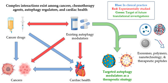 Cross-links between autophagy modulators, cancer treatments, cancer, and the heart. Current clinical practices in oncology and cardio-oncology focus on the interplay between cancer, its treatments, and their long-term effects on cardiac function. While autophagy has been shown to have promising cardioprotective effects in certain contexts, there is currently a lack of understanding regarding its effects on different cell types, especially under various disease and treatment conditions. Further investigations of autophagy’s mechanism and kinetics, as well as the creation of a translational cardio-oncology model, are required to realize its potential as a therapeutic strategy.