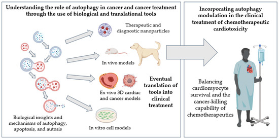 This review highlights non-small molecule approaches to modulate autophagy, including engineered peptides that target specific autophagy-regulating proteins or nanoformulations capable of increasing bioavailability to the target cell type or organ. Nanomedicine has been an active area of research for cancer therapy [166,167,168] and may be a novel approach to mitigating cardiotoxicity by targeting autophagy modulation [169,170,171]. Nanotechnology further allows the probe-based monitoring of autophagy levels non-invasively in vivo [164]. Moreover, novel translation model systems are now available for new cancer drug testing to bridge preclinical investigations to the clinical setting. These highlights are summarized in Figure 3.