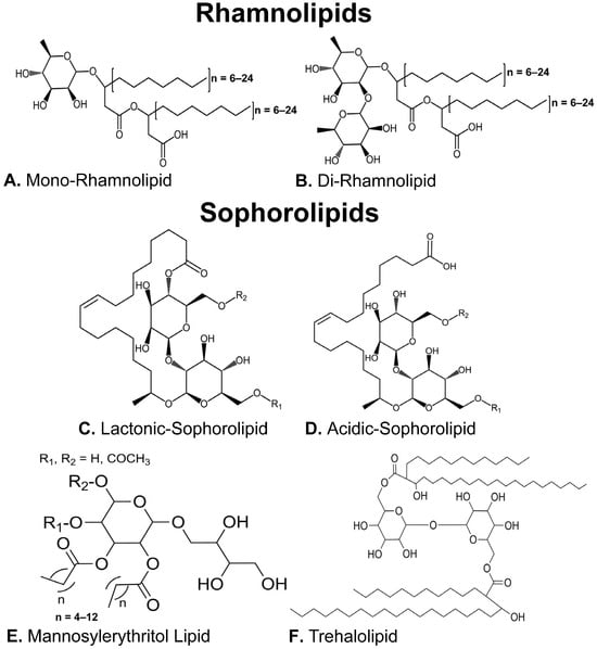 - Abdel-Mawgoud, A.M.; Lépine, F.; Déziel, E. Rhamnolipids: Diversity of Structures, Microbial Origins and Roles. Appl. Microbiol. Biotechnol. 2010, 86, 1323–1336. [Google Scholar] [CrossRef]