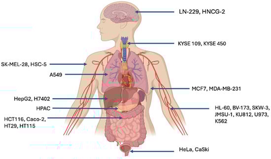Human cancer cell lines that have been detrimentally affected by glycolipid type biosurfactant congeners and their tissue of origin (figure generated using BioRender software version 04).