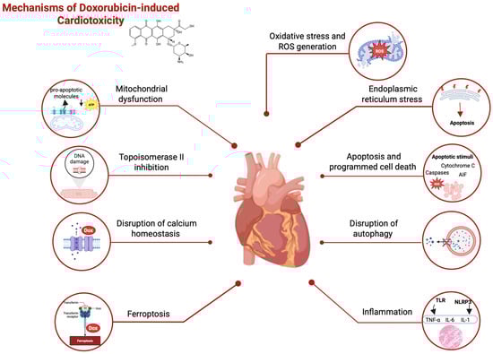 The cardiovascular toxicity of DOX involves multiple complex and interconnected mechanisms. The main known mechanisms include oxidative stress and reactive oxygen species (ROS) generation [24], mitochondrial dysfunction [25], topoisomerase II inhibition [26], disruption of calcium homeostasis [27], endoplasmic reticulum stress [28], apoptosis and programmed cell death [29], ferroptosis [30], inflammation [31,32], and disruption of autophagy [33], as seen in Figure 1. Despite extensive research, the exact mechanisms and their interactions are not fully understood and require further study to develop more effective therapeutic strategies to prevent and treat DOX-induced cardiotoxicity.