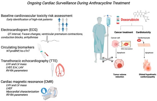 Continuous cardiovascular monitoring of patients during anthracycline therapy is essential to cardio-oncology management (Figure 2). It aims to detect possible therapy-induced cardiac changes early and prompt intervention to prevent severe complications [10].