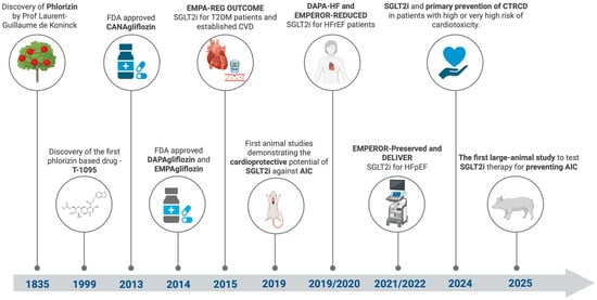 Using SGLT2 inhibitors during anthracycline therapy has shown significant advantages, including preserving cardiomyocyte structure, reducing myocardial fibrosis, and enhancing cardiac contractility. A comprehensive review published in 2024 captures the cardioprotective effects of SGLT2 inhibitors, which ultimately lead to improved cardiac remodeling, as evidenced by reduced left ventricular mass and improved LVEF [139]. Figure 3 provides a comprehensive timeline of key milestones, showcasing the pivotal discoveries, clinical advancements, and expanding therapeutic applications of SGLT2 inhibitors.