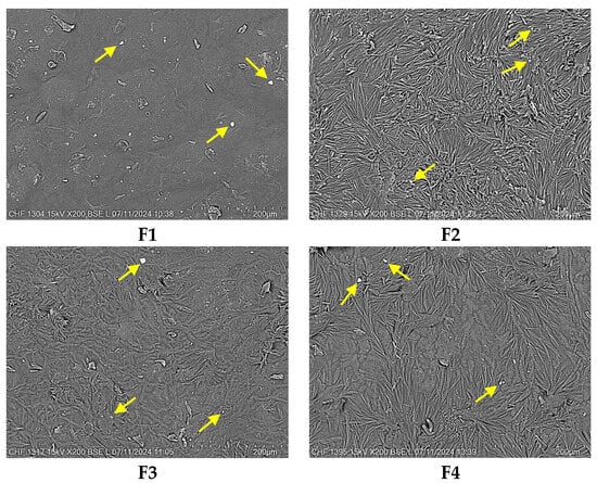 SEM micrographs of pH-sensitive film dressings at 200× magnification, scale bar of 200 μm. Yellow arrows indicated the presence of the drug particles on the surface of the film.