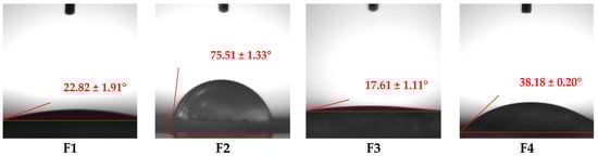 According to Figure 2, all films exhibited CA values lower than 90°, confirming their hydrophilic nature. CA values varied from 17.61 ± 1.11° for F3 to 75.51 ± 1.33° for F2.