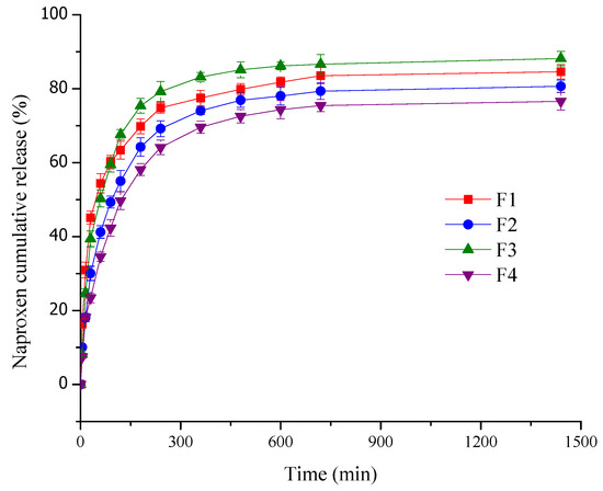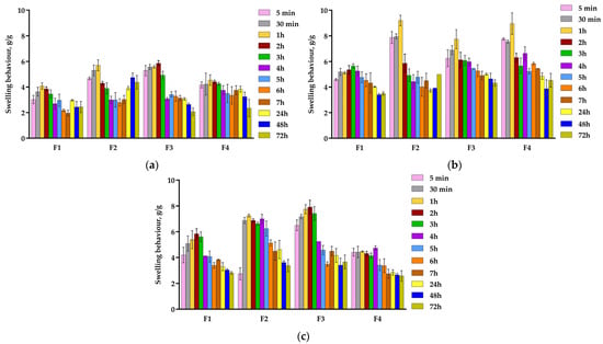 The lowest swelling values were recorded at pH 5.5, where the protonation of the carboxylic acid and hydroxyl groups decreased the swelling behavior because of the stronger intermolecular interactions [59]. All samples showed the maximum swelling after 1 h as follows: F3 (6.07 g/g), F2 (5.70 g/g), F4 (4.54 g/g), and F1 (4.08 g/g).