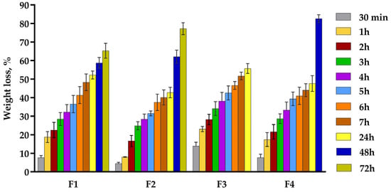 This analysis investigated the residual amount of film dressings after three days of incubation in collagenase solution. According to Figure 4, all samples registered a gradual increase in weight loss, with two of four formulations maintaining their structural stability after three days (F1 and F2), while F3 degraded after 24 h and F4 after 48 h.