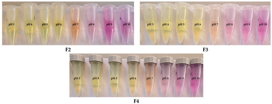 According to Table 4, for all formulations, a* values increased with the increase in pH: from 0.15 at pH 3 to 3.94 at pH 10 for F1, from −0.31 at pH 3 to 3.70 at pH 10 for F2, from −0.32 at pH 3 to 4.44 at pH 10 for F3, and from −0.72 at pH 3 to 4.09 at pH 10 for F4. This aspect indicated that the films’ color gradually turned redder at higher pH, consistent with phenol red behavior. On the other hand, b* became more negative with the increase in pH: for F1 from −8.20 at pH 3 to −14.40 at pH 10, for F2 from −7.93 at pH 3 to −14.19 at pH 10, for F3 from −7.39 at pH 3 to −14.75 at pH 10, and for F4 from −7.12 at pH 3 to −14.05 at pH 10, suggesting that the color progressively turned to blue/purple tones [85]. For F1, ΔE registered a visible increase from 1.60 (pH 3) to 4.41 (pH 4), showing early sensitivity. Then, the ΔE value slowly decreased with the increase in pH but also remained visible to the naked eye. F2 exhibited an increase in ΔE at pH 4–5, followed by a decrease at the next pH levels, while F3 registered a sharp jump from pH 3 to pH 4 and 5, where the ΔE value was about 3.5, meaning the sample is quite responsive in the acidic medium. The same trend was observed for the F4 sample, with a visible increase in ΔE from 1.42 (pH 3) to 3.33 (pH 5). Larger ΔE values signify that the pH-sensitive films can have proper color variation according to the pH value, which suggests adequate visual color variability [86]. The color changes of biopolymeric films were perceptible to the naked eye in multiple pH solutions, indicating that the designed films have a sensitive response to pH modification. Taking into account that the pH-sensitive films will be handled as wound dressings and the average pH of an injury is around 7, the color of the wound dressing will turn orange. When the skin is burned, the local pH will increase to around 8–8.5, and the color of the film dressing will change to fuchsia. If the burn injury heals, the film color will progressively change to yellow because normal skin has a pH value close to 5.5 [87].