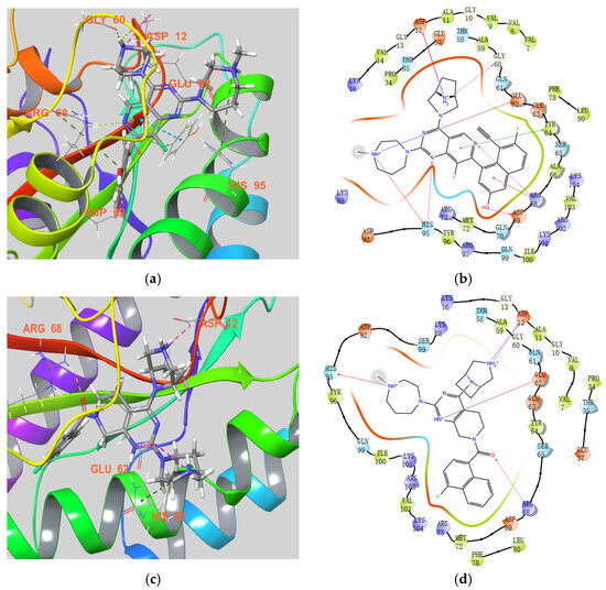 To gain deeper insights into the interactions between the compounds and the KRAS-G12D protein, compound 10k and 10c were selected for molecular docking studies, with the docking of MRTX1133 acting as the validation of the protocol. As shown in Figure 3, 10k effectively occupied the protein binding pocket, with the N-methyl group of homopiperazine extending into the solvent-exposed region. This position provides a strategic site for linker arm installation in PROTAC design, consistent with current strategies in targeted protein degradation approaches [26]. The secondary amine of the piperazine moiety, upon quaternization, functioned as both a hydrogen bond acceptor and donor, forming critical interactions with the key residues ASP12 and GLY60, which are crucial for selective KRAS-G12D engagement [27]. Additionally, the nitrogen atom in the homopiperazine ring could undergo quaternization to establish pi-cation with HIS95, a type of non-covalent force increasingly recognized for enhancing binding affinity and specificity in small-molecule design [28]. More importantly, this kind of interaction was not observed in the docking of MRTX1133. The phenolic hydroxyl group on the naphthalene ring of 10k acted as a hydrogen bond donor interacting with ASP69, while the pyridyl nitrogen atom functioned as a hydrogen bond acceptor engaging ARG68. These multiple polar interactions collectively stabilize the ligand–protein complex and highlight the potential of compound 10k as a valuable lead for KRAS-G12D-targeted therapies.