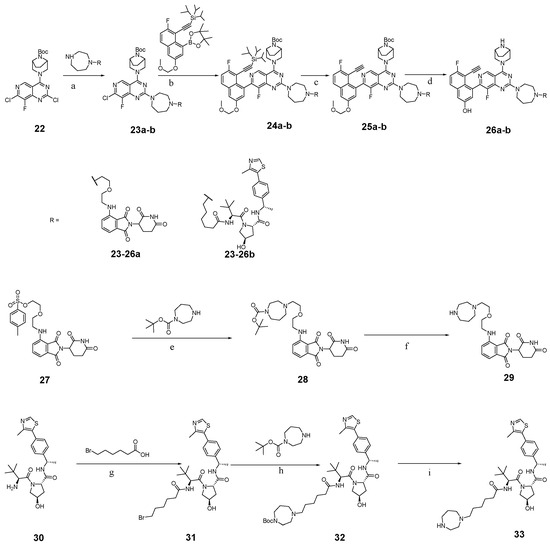 Compound 23a was prepared from starting material 29 using the method applied for compound 23, yielding a yellow solid with a 52.78% yield. 1H NMR (600 MHz, Chloroform-d) δ 8.50 (s, 1H), 7.57–7.45 (m, 1H), 7.11 (d, J = 7.1 Hz, 1H), 6.90 (t, J = 9.1 Hz, 1H), 6.47 (d, J = 6.6 Hz, 1H), 4.90 (dd, J = 12.1, 5.4 Hz, 1H), 4.46–4.20 (m, 4H), 4.12–3.76 (m, 4H), 3.71–3.66 (m, 2H), 3.66–3.62 (m, 1H), 3.60–3.48 (m, 2H), 3.44 (t, J = 5.4 Hz, 2H), 3.09–2.59 (m, 8H), 2.16–1.98 (m, 2H), 1.95–1.89 (m, 2H), 1.78–1.71 (m, 2H), 1.69–1.58 (m, 3H), 1.50 (s, 9H). 13C NMR (151 MHz, Chloroform-d) δ 171.1, 168.4, 159.6, 153.5, 143.8, 136.2, 132.7, 116.9, 111.9, 110.4, 109.3, 80.5, 69.5, 69.4, 55.5, 54.9, 53.5, 49.0, 46.3, 42.4, 31.5, 28.6, 22.9.