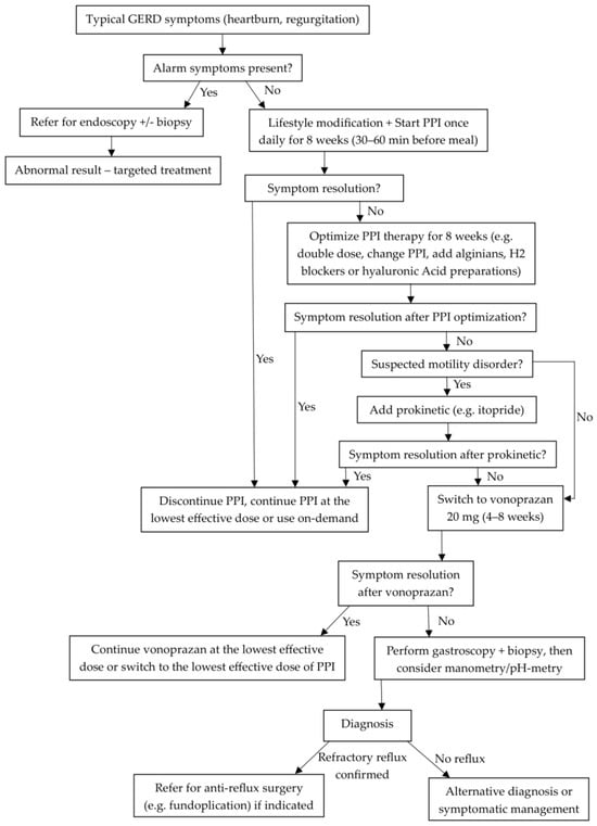 According to the 2022 guidelines of the American College of Gastroenterology (ACG), the initial management of typical GERD symptoms consists of an empirical trial of a standard-dose proton pump inhibitor (PPI) once daily for eight weeks, taken 30–60 min before the first meal. If symptoms persist, optimization of the PPI therapy by verifying intake timing and possibly increasing to twice-daily dosing is recommended. Long-term maintenance with the lowest effective PPI dose is advised in erosive esophagitis. In patients without erosive disease or Barrett’s esophagus whose symptoms resolve, the discontinuation of PPIs or switching to on-demand therapy is suggested. Diagnostic endoscopy is recommended if alarm symptoms, atypical symptoms, or persistent symptoms occur, ideally after a 2–4-week discontinuation of the PPI therapy. In patients with nighttime symptoms, bedtime H2 receptor antagonists may be added, while prokinetics are reserved for those with gastroparesis. In patients with persistent symptoms despite optimized PPI therapy, the routine addition of adjunctive medical therapies is not recommended; instead, further diagnostic evaluation should be pursued to guide management [13].