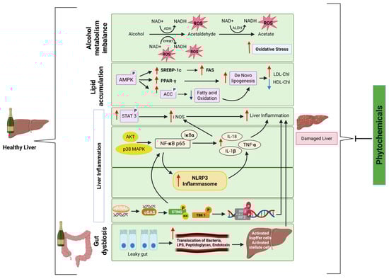 A comprehensive literature search was conducted in 2024, using PubMed, Google Scholar, Web of Science, and Science Direct databases. The search aimed to identify relevant studies published between 2005 and 2024 and employed the following search terms: “Alcohol-induced liver disease and Phytochemicals”, “Alcohol-induced liver disease and inflammation”; “Alcohol-induced liver disease and cGAS-STING signaling”; “Alcohol-induced liver disease and NLRP3 inflammasomes”; “Alcohol-induced liver disease and NF-κB signaling”; “Alcohol-induced liver disease and MAPK signaling”; and “Alcohol-induced liver disease and JAK-STAT signaling”.