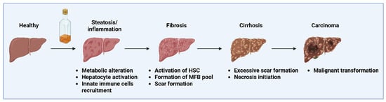 Stages of ALD. The illustration depicts the stage of the ALD from inflammation to hepatocellular carcinoma. Abbreviations: HSC, hepatic stellate cells; MFB, myofibroblasts.