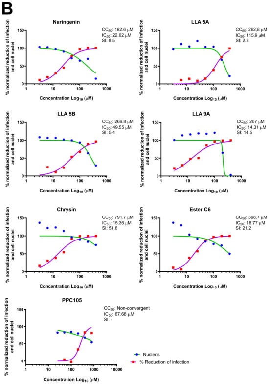 - Cataneo, A.H.D.; Kuczera, D.; Koishi, A.C.; Zanluca, C.; Silveira, G.F.; de Arruda, T.B.; Suzukawa, A.A.; Bortot, L.O.; Dias-Baruffi, M.; Verri, W.A.; et al. The Citrus Flavonoid Naringenin Impairs the in Vitro Infection of Human Cells by Zika Virus. Sci. Rep. 2019, 9, 16348. [Google Scholar] [CrossRef]