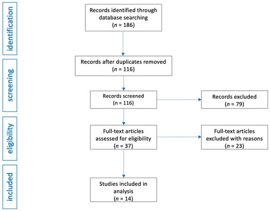 The PubMed database search yielded an initial pool of 186 potentially eligible studies. A review of the reference lists of the initially retrieved articles did not identify any additional studies. After screening titles and abstracts, 70 duplicate studies were excluded, and 79 articles were removed based on the inclusion criteria. Of the remaining 37 studies, 23 were further excluded due to a lack of relevant results or content unrelated to the research topic upon full-text review.
